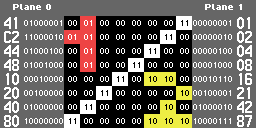 예를 들어, 타일의 행 번호가 0부터 7까지인 경우, 왼쪽 패턴 테이블의 타일 $69의 1행은 평면 0이 $0691에, 평면 1이 $0699에 저장된다.